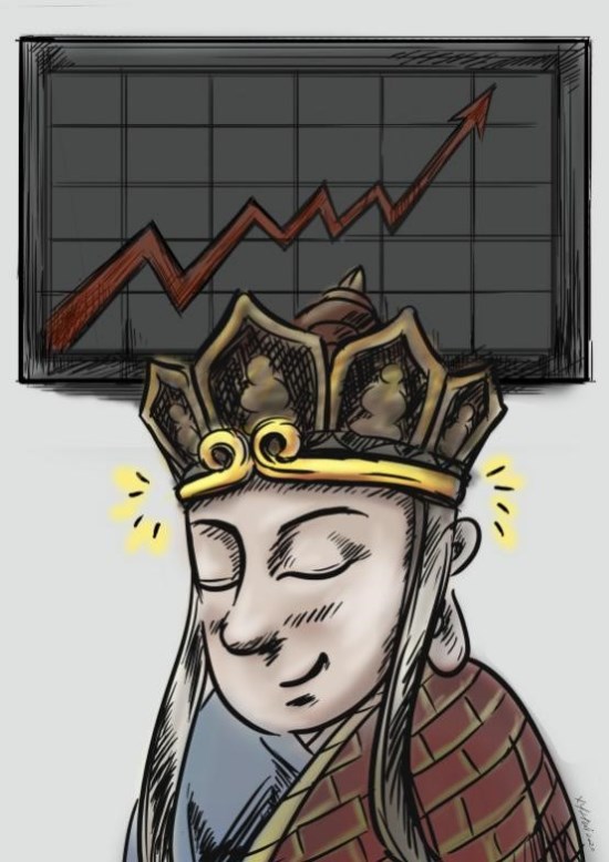 賞析:作品緊扣人物性格特點,愛念經的唐僧給自己戴上緊箍咒,巧妙彰顯理性投資理念。