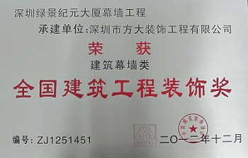 “全國(guó)建筑工程裝飾獎(jiǎng)”是國(guó)家住房和城鄉(xiāng)建設(shè)部批準(zhǔn)設(shè)立的中國(guó)建筑裝飾行業(yè)的最高榮譽(yù)獎(jiǎng),由中國(guó)建筑裝飾協(xié)會(huì)主辦評(píng)選,每?jī)赡暝u(píng)選一次。此次深圳市方大裝飾工程有限公司一舉獲得四項(xiàng)“全國(guó)建筑工程裝飾獎(jiǎng)”,突顯了方大幕墻在建筑裝飾行業(yè)設(shè)計(jì)與施工水平等方面的優(yōu)勢(shì),反映了方大裝飾公司在企業(yè)管理、技術(shù)實(shí)力、質(zhì)量保證體系等方面的實(shí)力。