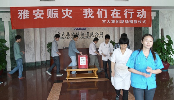 4月20日8時02分,四川省雅安市蘆山縣發生7.0級地震,人民生命財產遭受重大損失。一方有難,八方支援。在雅安人民在遭受災難的時候,方大集團在第一時間號召集團全體員工為災區捐款,支持雅安人民抗震救災。集團總部和分布在北京、上海、成都、沈陽、南昌、東莞等全國各地的方大集團員工紛紛捐款,以實際行動獻愛心。據不完全統計,截至4月23日,方大集團已經向雅安地震災區捐款已達257462元,以幫助災區人民重建家園,與災區人民一起共渡危難。這也是繼向汶川、玉樹地震災區捐款后,方大集團再一次向震區人民伸出援手,是方大集團“報國報民報一方”大愛精神的再次彰顯。