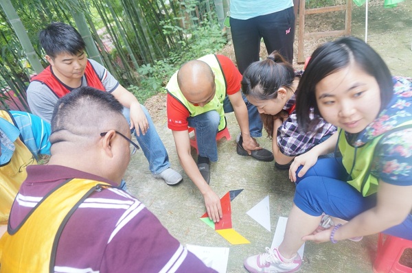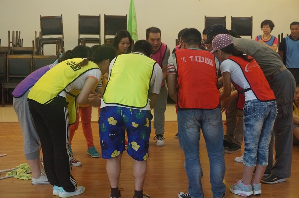集合、報數(shù)、整隊、分組,一行人被分為6組開始不同主題的拓展活動,學員們分別進行了“國王與天使”、“目標市場”、“七巧板”、“團隊動力圈”、“挑戰(zhàn)99”、“合力致勝”和“畢業(yè)墻”等拓展科目。