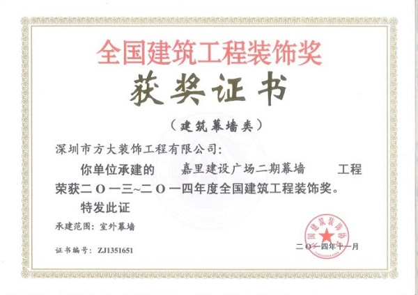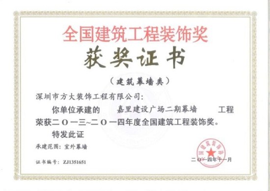 “2013-2014年度全國(guó)建筑工程裝飾獎(jiǎng)”獲獎(jiǎng)結(jié)果在北京揭曉,深圳市方大建科集團(tuán)有限公司榮獲四項(xiàng)建筑幕墻類(lèi)大獎(jiǎng),獲獎(jiǎng)項(xiàng)目分別為:中鐵南方總部大廈幕墻工程、大連萬(wàn)達(dá)公館1#樓幕墻工程、嘉里建設(shè)廣場(chǎng)二期幕墻工程、中廣核大廈幕墻工程。