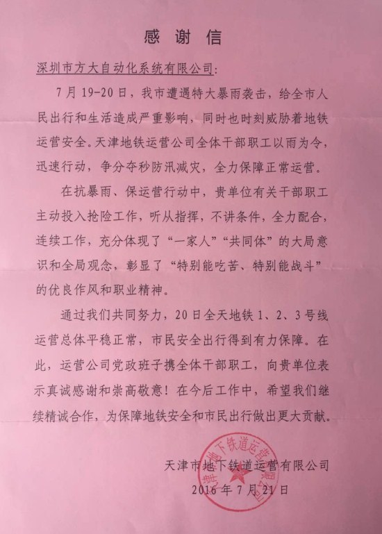 近日,天津地鐵運營公司向方大自動化系統有限公司發來感謝信,高度評價自動化公司在天津地鐵“抗暴雨、保運營”行動中的優良表現。感謝信說,