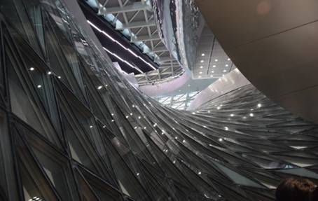 別具匠心體現(xiàn)創(chuàng)新能力。本項(xiàng)目的另一大亮點(diǎn)就是室內(nèi)的云雕塑下方的勺子幕墻系統(tǒng),因?yàn)槠湫螤钕褚话褱锥妹鋵?shí)是一個(gè)雙面雙層扭曲的、兼具防火隔斷功能的室內(nèi)幕墻系統(tǒng),該幕墻的主體異形鋼結(jié)構(gòu)由方大人設(shè)計(jì)、施工完成,工期只用了30天。