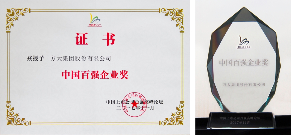 11月18日,第十七屆中國上市公司百強高峰論壇在北京舉行,同時公布了“2017年中國上市公司百強排行榜”,方大集團股份有限公司獲頒“中國百強企業獎”。