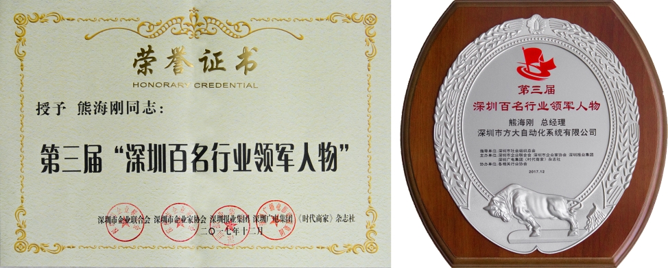 2017年12月,方大集團股份有限公司全資子公司深圳市方大自動化系統(tǒng)有限公司總經理熊海剛作為深圳城市軌道交通領域領軍人物代表當選“深圳百名行業(yè)領軍人物”。