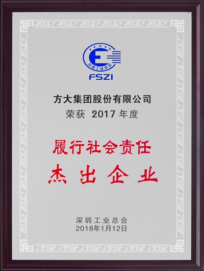 2017年度“履行社會責任杰出企業”榮譽稱號由深圳工業總會評選,授予積極履行社會責任、有極強的社會責任榮譽感的企業,本屆共有包括方大集團在內的19家企業獲得了該項榮譽稱號。