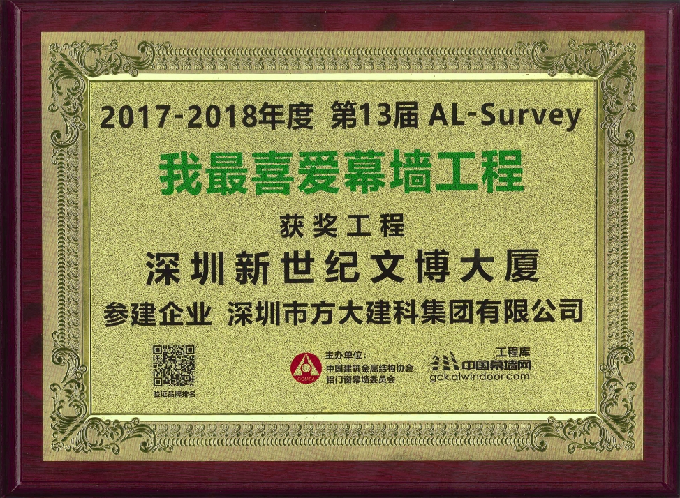 此次,憑借深圳新世紀文博大廈獲得行業評選“我最喜愛幕墻工程”獎,反映了業內對該工程幕墻施工技術的高度認同以及對方大建科實力的肯定 ,同時也是方大建科回饋客戶信任的最好成績單。