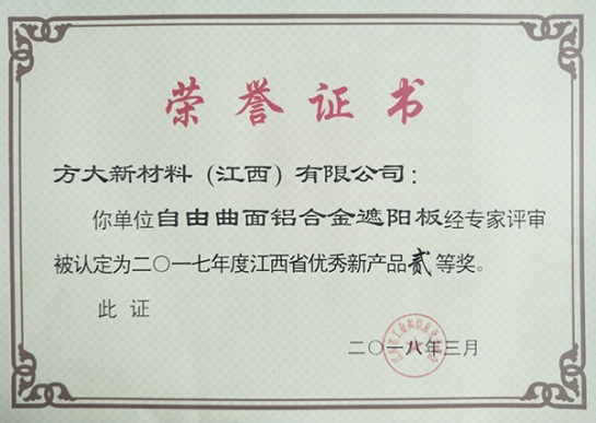 近日,江西省工信委在全省工業(yè)和信息化技術創(chuàng)新工作會公布了2017年度優(yōu)秀新產(chǎn)品獲獎名單,方大集團全資子公司方大新材料(江西)有限公司的“青花瓷鋁單板”、“自由曲面鋁合金遮陽板”兩項新產(chǎn)品獲得了2017年江西省優(yōu)秀新產(chǎn)品二等獎。