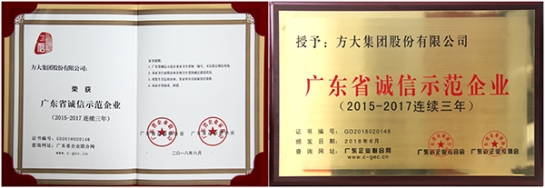 6月14日,廣東省弘揚(yáng)優(yōu)秀企業(yè)家精神暨誠信建設(shè)大會(huì)在廣州舉行,會(huì)議對2017年度廣東省誠信示范企業(yè)進(jìn)行了表彰。方大集團(tuán)守法經(jīng)營、依法納稅、積極維護(hù)消費(fèi)者及員工合法權(quán)益、自覺履行社會(huì)責(zé)任,被授予“廣東省誠信示范企業(yè)”榮譽(yù)稱號(hào),這也是方大集團(tuán)自2015年以來連續(xù)三年榮獲該稱號(hào)。