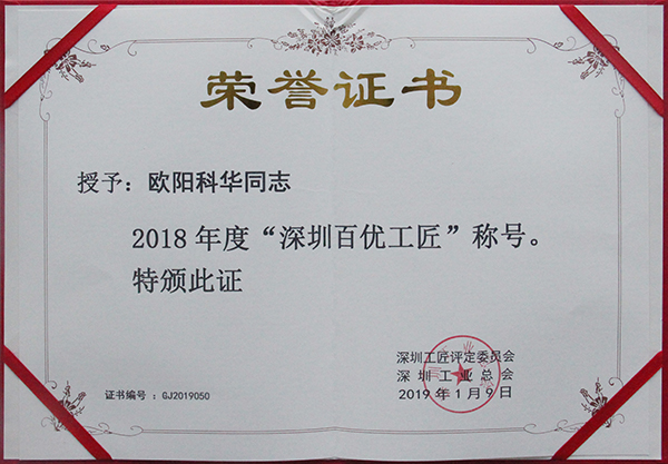 為促進深圳市技能人才隊伍建設,培養深圳工匠群體,弘揚崇尚技能、尊重人才的深圳工匠精神,深圳工業總會組織開展第三屆“深圳百優工匠”評選活動。方大智創科技員工歐陽科華、朱振飛、孔德兵在技術創新、攻克技術難關、傳承傳統工藝等方面做出較大成績,具有良好的職業道德和敬業精神,并在公司里產生良好經濟社會效益和示范作用。他們不僅在企業充分證明了他們的價值,此次獲得的殊榮更表明他們得到行業的尊敬和認可。
