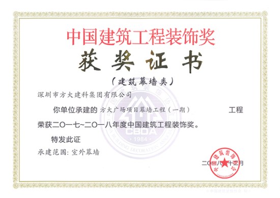 中國建筑工程裝飾獎是由中國建筑裝飾協會主辦的評選活動,自2001年起每年進行評選,是建設部批準設立的中國建筑裝飾行業的最高榮譽獎。方大建科承建的四項幕墻工程獲此獎項,是對公司精湛的幕墻設計能力和先進的施工工藝的充分肯定。