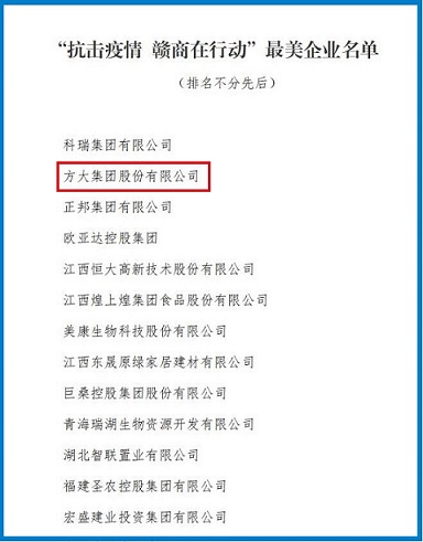 近日,江西贛商聯(lián)合總會(huì)、贛商雜志社發(fā)布關(guān)于表彰在“抗擊疫情 贛商在行動(dòng)”活動(dòng)中最美商會(huì)、最美企業(yè)、最美企業(yè)家的通報(bào),表彰贛商企業(yè)和江西商會(huì)在抗擊疫情中做出的突出貢獻(xiàn),方大集團(tuán)榮獲最美企業(yè)稱號(hào)。