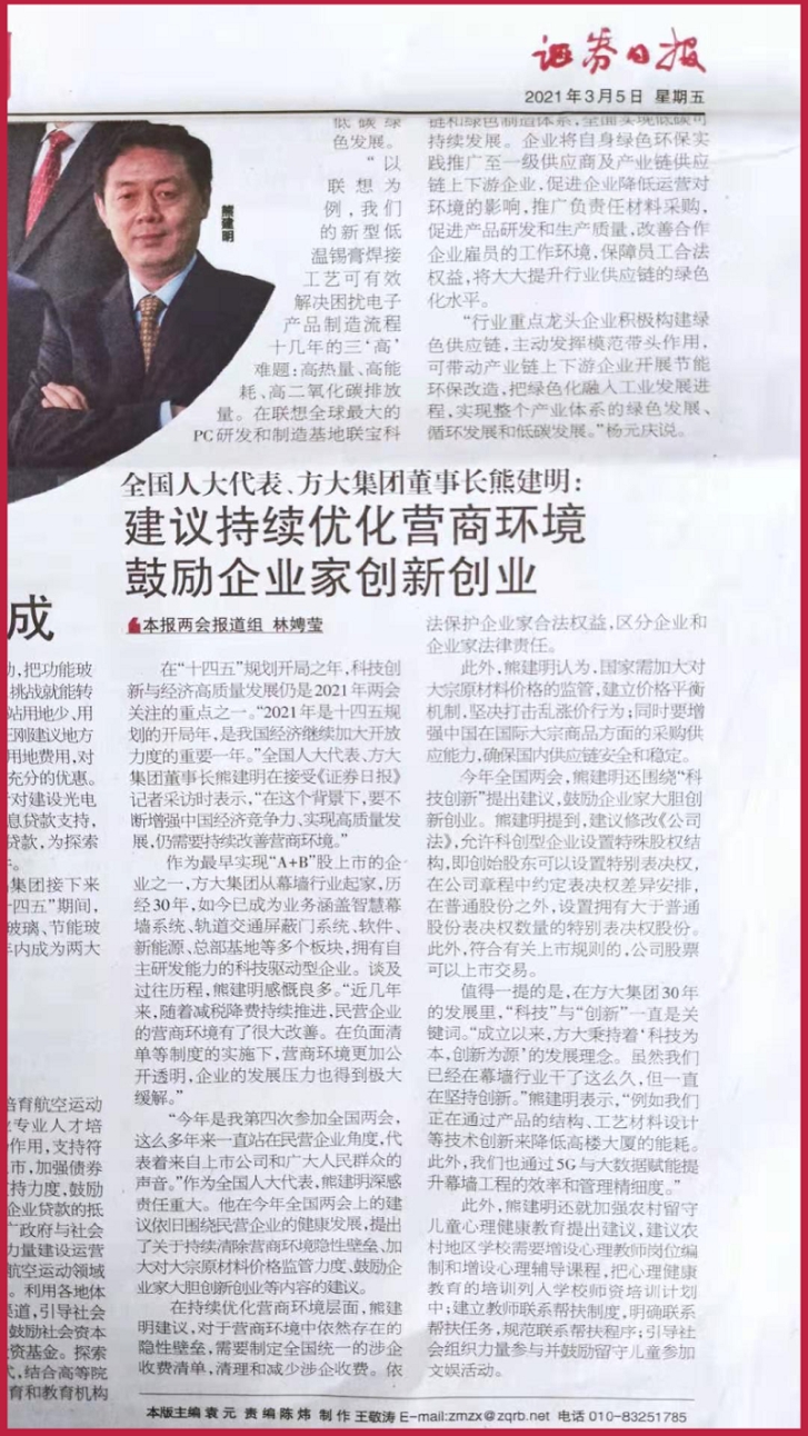 在“十四五”規劃開局之年,科技創新與經濟高質量發展仍是2021年兩會關注的重點之一。“2021年是十四五規劃的開局年,是我國經濟繼續加大開放力度的重要一年。”全國人大代表、方大集團董事長熊建明在接受《證券日報》記者采訪時表示,“在這個背景下,要不斷增強中國經濟競爭力、實現高質量發展,仍需要持續改善營商環境。”